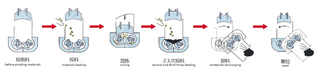 由制动电机,摆线减速机和铜蜗轮结构组成机械翻转,也可选用我公司独家研发,行业领先水平的液压翻转,推动混炼室翻转140度卸料。
